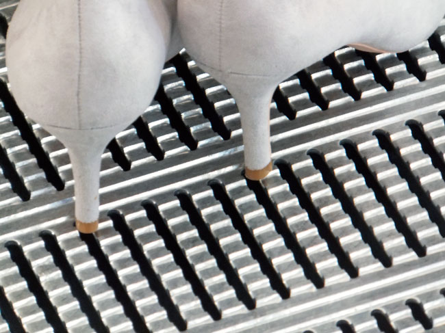 リブを備えた鋼板に排⽔孔を設けることで形成された凹凸構造と、その間を⾛るリブのラインがアクセントとなり、⼈の⽬を引く美しいデザインを⽣み出します。ヒールがはまらない排⽔孔。