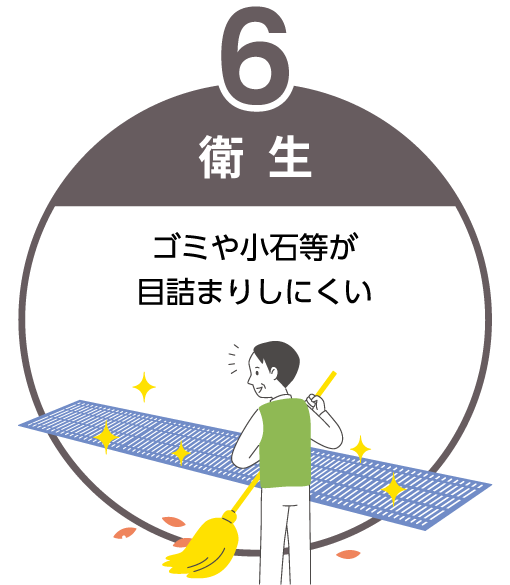 鋼板部分には細い孔をあけ、⽀えている格⼦の間は広い空間が確保されており、⽬詰まりしにくいため排⽔不良等の機能性を損なわず、衛⽣的です。